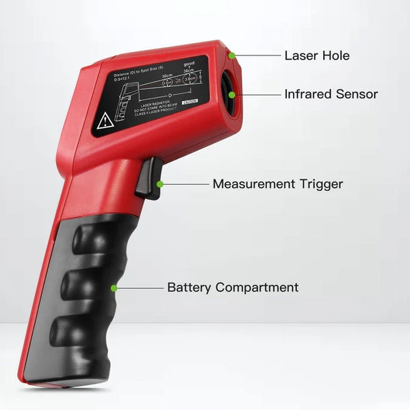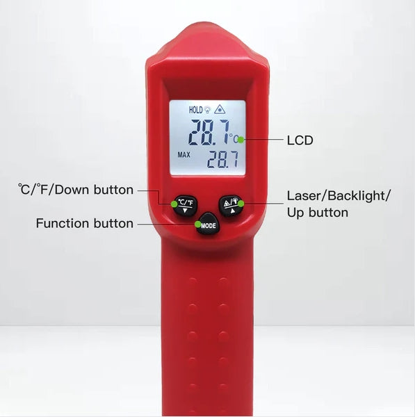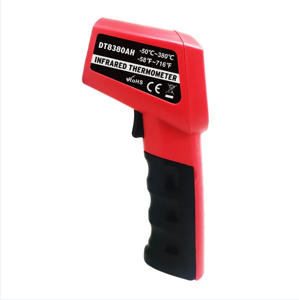 The digital laser gun features a wide temperature measuring range of -50℃~380℃, with a high accuracy of ±2℃. It uses the non-contact infrared sensing technology to ensure safe, accurate, fast and reliable temperature measurement for target objects. The infrared thermometer is widely used for temperature measurement in high-temperature or dangerous environment in the industries like machinery, chemical engineering, ceramics, light industry, food, metallurgy, electricity, heat treatment, and other places where it is difficult to access the surface of the objects.