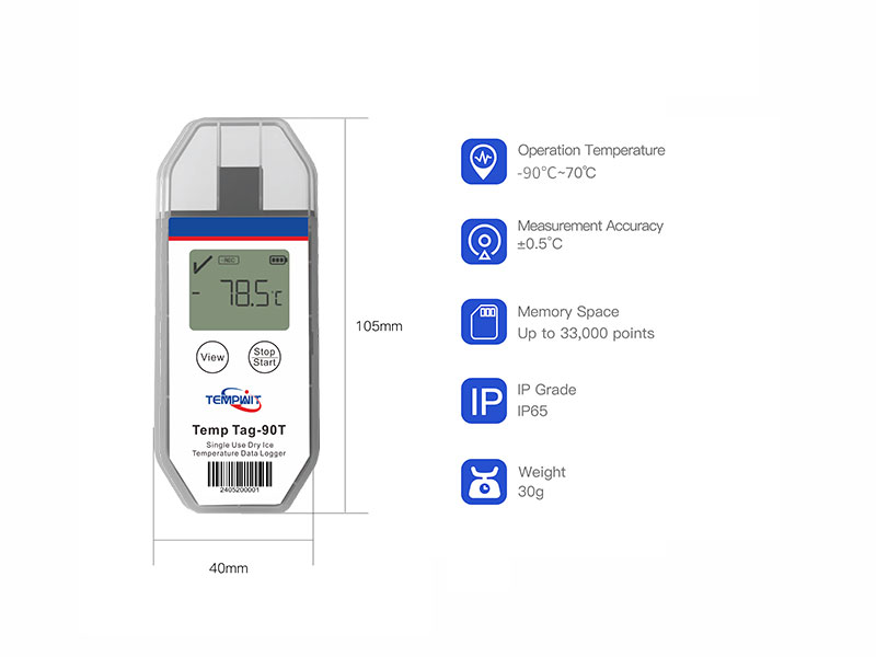 The Temp Tag-90T is a single-use, ultra-low temperature data logger specifically engineered for reliable temperature monitoring in dry ice shipping and storage environments. It is designed to track and record temperature data throughout the entire cold chain journey, ensuring compliance with strict temperature control regulations for temperature-sensitive products such as pharmaceuticals, vaccines, biological samples, and frozen foods.