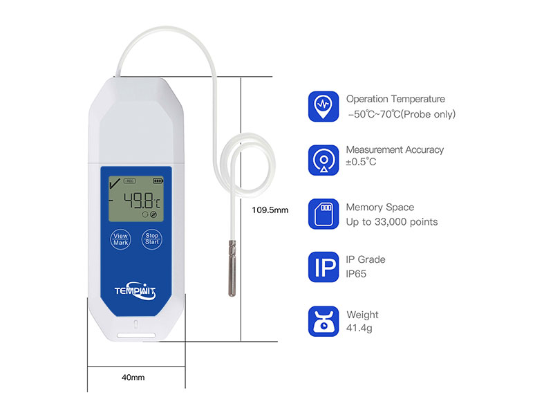 Temp Log‑T50 is a reusable, high‑accuracy temperature data logger equipped with an external probe, specially designed for reliable temperature monitoring in harsh, deep, or enclosed environments where built‑in sensors cannot reach. It supports repeated programming and long‑term use, providing stable temperature records for cold chain, industry, laboratory and storage.